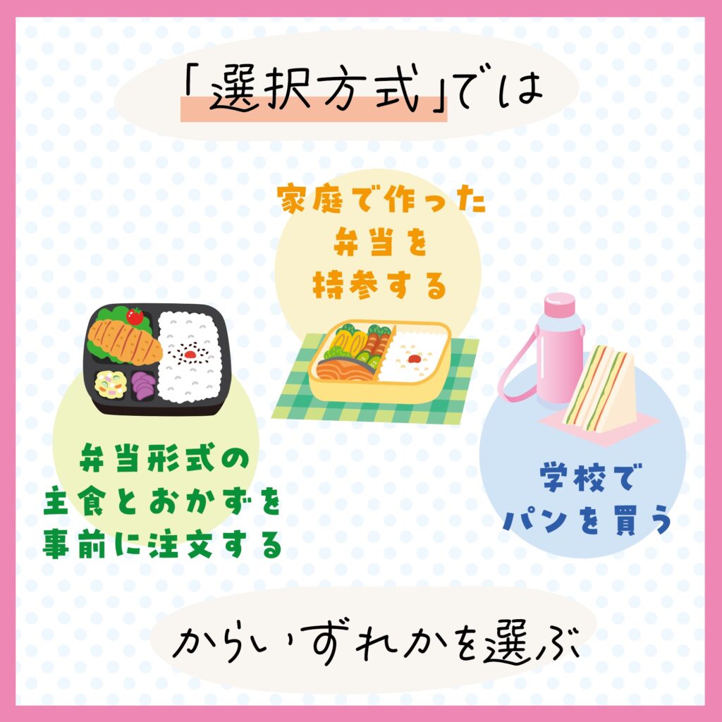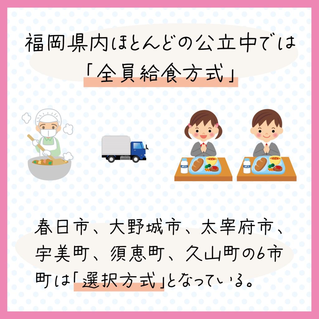 県内ほとんどの自治体は「全員給食」方式ですが、春日市、大野城市、太宰府市、宇美町、須恵町、久山町の6市町が「選択方式」となっています。