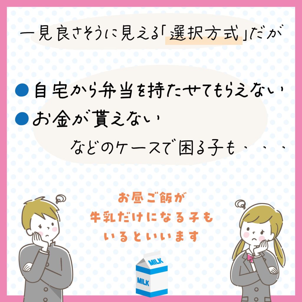 一見良さそうに見える「選択方式」ですが、注文制の弁当給食を「親が申し込まない」「自宅から弁当を持たせてもらえない」「お金が貰えない」などのケースがあり、お昼の食事は「牛乳のみ」となる場合があるといいます。「選択方式」対象の地域からは、中学校3年間を含めた義務教育の間は、家庭環境に左右されず栄養バランスのとれた、「全員給食」にして欲しいという切実な声が上がっています。